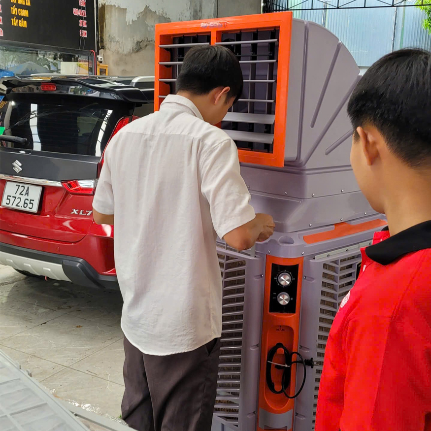 - Quạt làm mát hơi nước hoạt động vào hiện tượng bốc hơi nước tự nhiên .Hạ nhiệt độ phòng 3-5 độ nhờ vào hệ thống làm mát Cooling Pad.