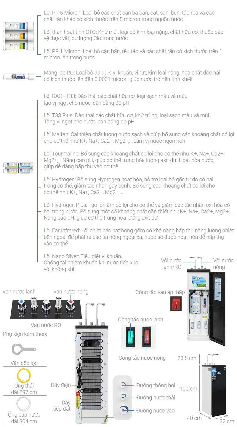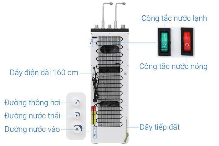 Dung tích bình chứa: Tổng 9 lít (Nước nóng 1 lít, nước lạnh 1.5 lít, nước thường 6.5 lít)