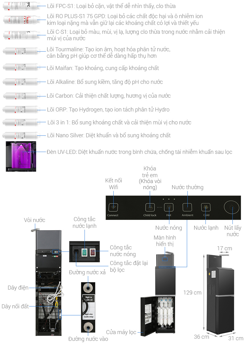 Dung tích bình chứa: Tổng 4.8 lít (Nước nóng lọc trực tiếp, nước lạnh 1.8 lít, nước thường 3 lít)