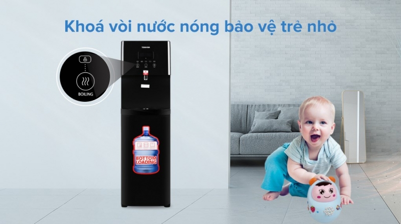 - Khóa vòi nước nóng là chức năng an toàn khi gia đình có trẻ nhỏ. Muốn lấy nước nóng, nhấn và giữ nút mở khóa trong 3 giây. Đèn báo khóa sẽ bị tắt đi, trong vòng 3 giây không lấy nước chức năng tự động khóa lại và đèn báo khóa sáng lên.