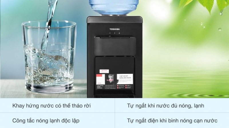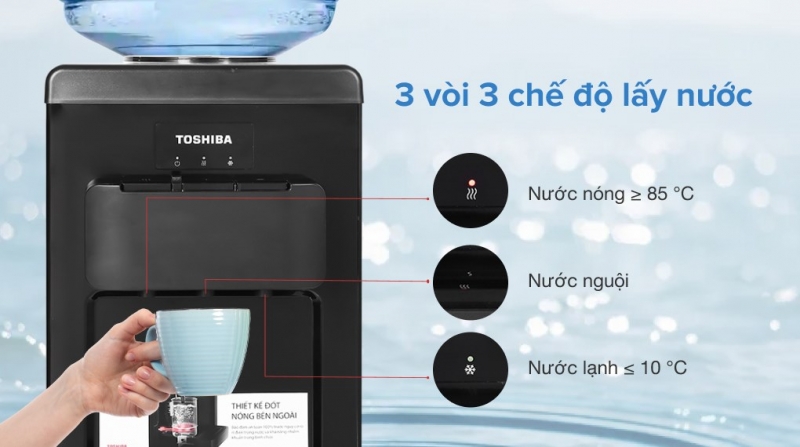 - Máy nước nóng lạnh Toshiba còn thiết kế đun nóng bên ngoài. Bình Chứa nước của sản phẩm làm bằng Inox 304, bình Lạnh được thiết kế nguyên khối. Nhờ đó đảm bảo sự an toàn cho người sử dụng khỏi sự nhiễm điện/gỉ sét của thanh đốt khi tiếp xúc trực tiếp với nguồn nước.