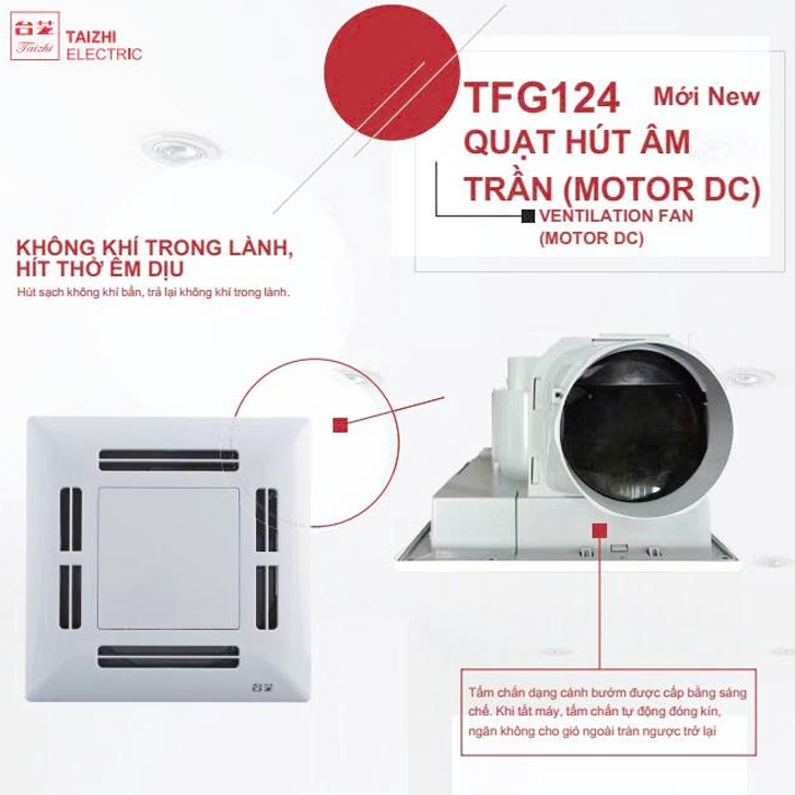 - Quạt hút âm trần Taizhi TFG-124 nhập khẩu trực tiếp Đài Loan. Động cơ quạt được thiết kế ứng dụng của động cơ ly tâm cho chất lượng tiếng ồn thấp.