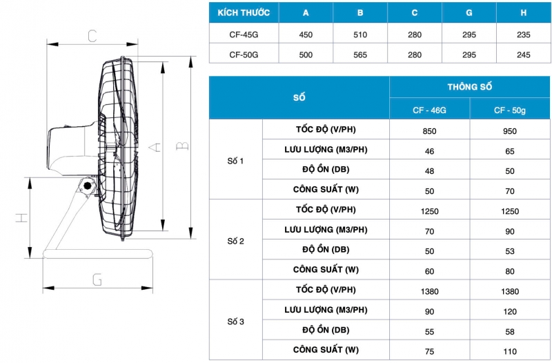 - Tốc độ 1 (950 rmp) - Tốc độ 2 (1250 rmp) - Tốc độ 3 (1380 rmp)