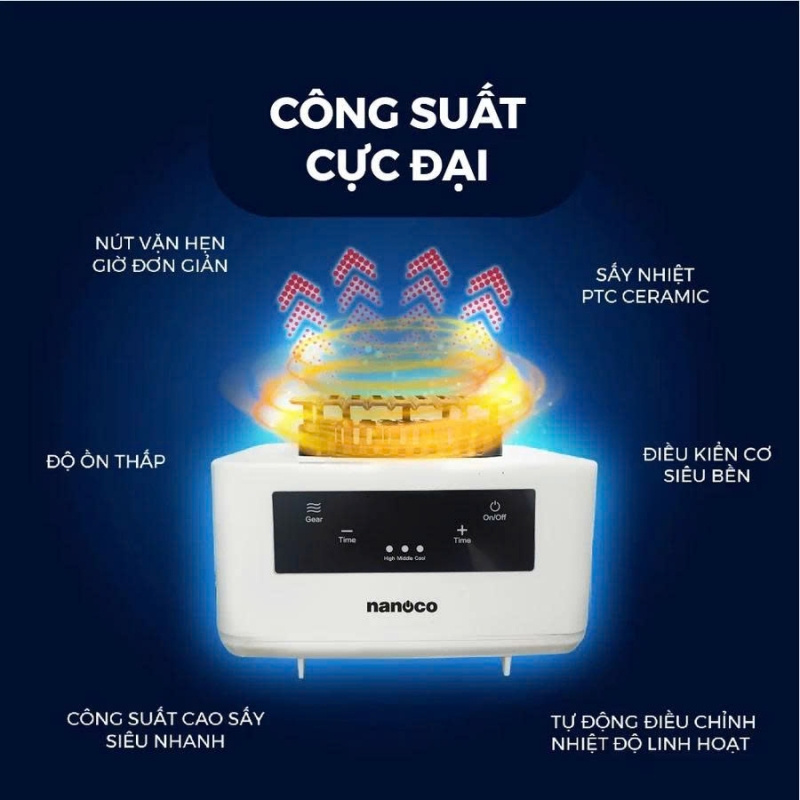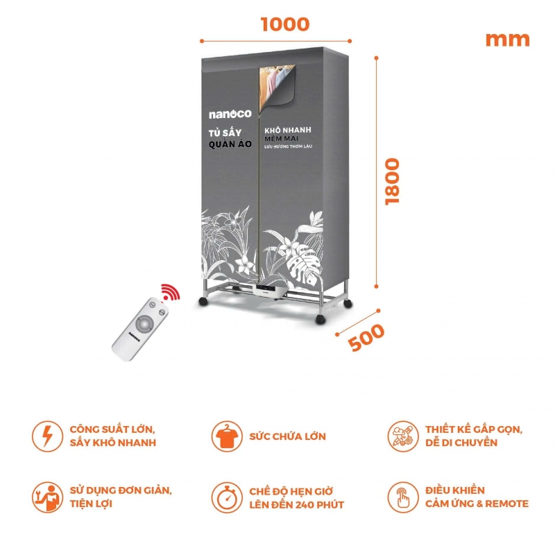 - Tủ sấy quần áo Nanoco NCD2024RC với tấm sưởi PTC và biến áp hiện đại, cục sấy làm nóng không khí nhanh, giữ nhiệt ổn định để quần áo khô nhanh mà vẫn bền, lưu giữ hương thơm lâu từ nước giặt xả.